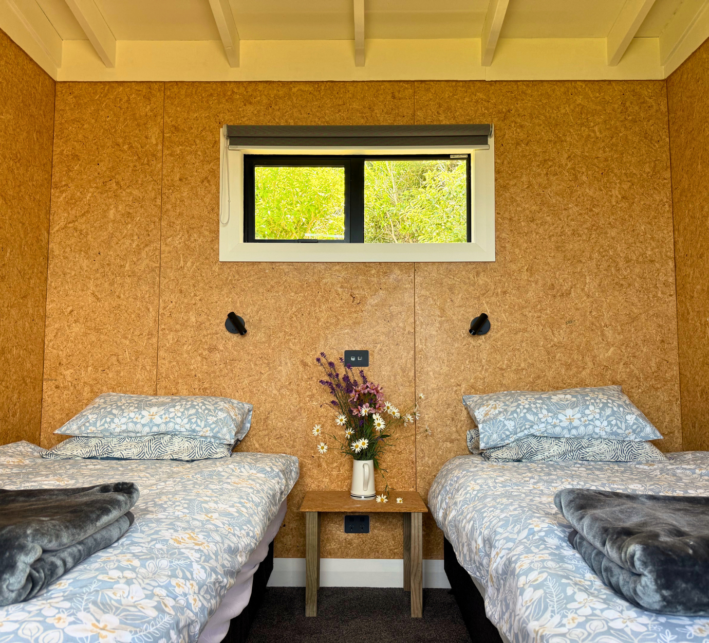 “The Roost” offers four bedrooms each with two comfortable king single beds with linen, blankets and pillows and two bathrooms with modern facilities- no need to use the long drop (yes there is one!).